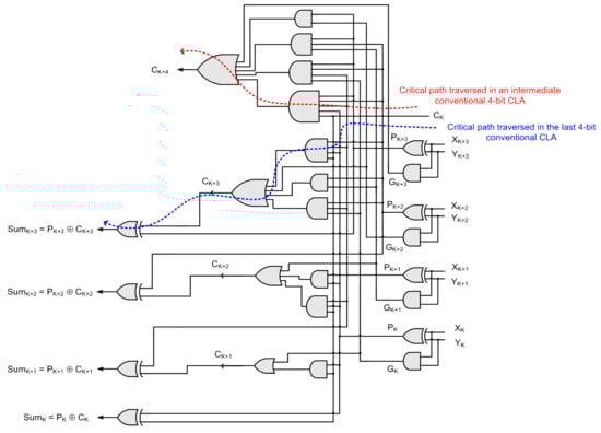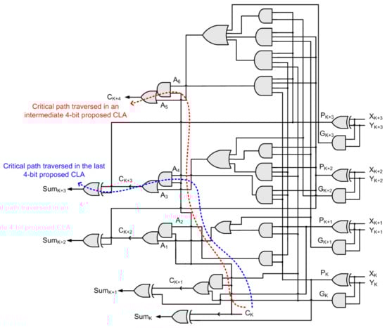 The logic realization of an example proposed 4-bit CLA, described by Equations (3) and (14)–(16), is portrayed by Figure 4. The critical path that would be traversed when this 4-bit CLA would be present in an intermediate stage in Figure 2 is highlighted by the red dashed line and the critical path that would be traversed when this 4-bit CLA would be present in the final stage in Figure 2 is highlighted by the blue dashed line.