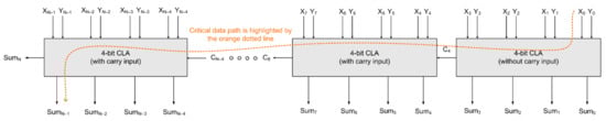 Typically, an N-bit CLA is constructed using a cascade of M-bit CLAs where N and M are even and N modulo M = 0. For example, a 32-bit CLA can be constructed by cascading eight 4-bit CLAs. Figure 2 shows a block diagram of an N-bit CLA constructed using 4-bit CLAs, and the critical path is highlighted by the orange dotted line. Supposing that the 4-bit CLA shown in Figure 1 is present in an intermediate stage of an N-bit CLA, as shown in Figure 2, then theoretically the critical path that would be traversed through the 4-bit CLA would be as highlighted by the red dashed line in Figure 1, which consists of a 5-input AND gate and a 5-input OR gate. In modern standard digital cell libraries, the fan-in of AND and OR gates are limited to four. So, a 5-input AND/OR gate may be decomposed into a combination of two 3-input AND/OR gates, respectively. Supposing the 4-bit CLA shown in Figure 1 is present in the last stage of Figure 2, then the critical path that would be traversed is highlighted by the blue dashed line shown in Figure 1.