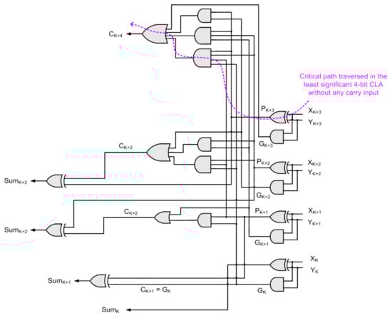 In Figure 2, it can be seen that the first (least significant) 4-bit CLA does not have a carry input while the rest of the 4-bit CLAs have a carry input. Hence, in the absence of a carry input, i.e., considering CK = 0 in Equations (3)–(6), the gate-level realization of a 4-bit CLA without any carry input would be as shown in Figure 3, and its critical path is highlighted by the pink dashed line.
