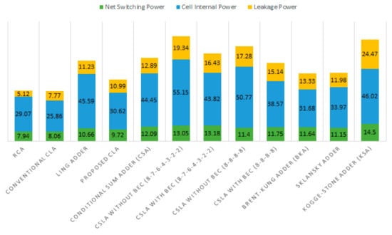 Split-up of total power dissipation of different adders, estimated using PrimePower.