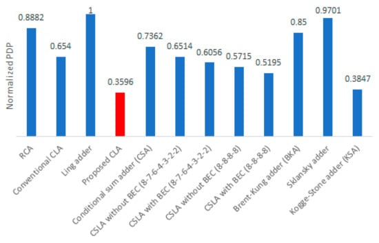 Besides the individual considerations of delay and power, it is important to analyze the performance of adders from an energy perspective, which is given by the product of total power and the critical path delay. This is because an evaluation of energy gives information about any trade-off between power and delay in a digital circuit []. Since power and delay are preferred to be less, therefore, the product of power and delay (PDP) is preferred to be less. In other words, the lesser the PDP, the more energy-efficient is a design. PDP was calculated for all the adders and those values were then normalized. To perform the normalization, the highest PDP value (corresponding to the Ling adder) was used to divide the actual PDP of all the adders. The normalized PDP plots of the adders are shown in Figure 6 with the optimum plot shown in red. An adder with a lesser normalized PDP value is preferable. Given this, the Ling adder is found to be less energy-efficient compared to the other adders. From Figure 6, it is seen that the proposed CLA has an optimized normalized PDP compared to its counterparts, which implies the proposed CLA is more energy-efficient. Compared to the conventional CLA, the proposed CLA is 45% more energy-efficient. The KSA consumes 7% more energy than the proposed CLA, although it is faster, and this is due to its increased power dissipation in comparison on account of its greater area occupancy. Hence, from Table 1 and Figure 6, it may be concluded that the proposed CLA offers a good trade-off between speed, power, and area compared to its counterparts.