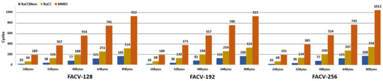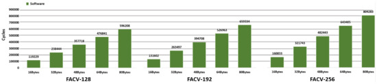 - RoCC: The number of clock cycles required by the FACV-128 to encrypt a 16-byte and an 80-byte message is, respectively, 66 and 314, which corresponds to a performance increase of 1807× and 1899×. The FACV-192 requires 68 and 324 clock cycles to encrypt a message of 16 and 80 bytes, respectively, which corresponds to a performance increase of 6580× and 3972×. Regarding the FACV-256, these values are nearly the same as the FACV-192, corresponding to a performance gain of 1935× and 2035× for a message size of 16 and 80 bytes in the FACV-192 configuration and a performance increase of 2401× and 2408× for a respective message size of 16 and 80 bytes in the FACV-256 implementation. Overall, the performance gains for both the FACV-192 and the FACV-256 for the different message sizes increase when compared with the corresponding software version.