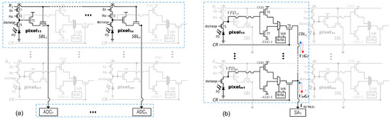 In the sensing mode, initially setting = ‘high’, the PD connected to the T2 transistor turns into inverse polarization. In this way, turning on the access transistor T4 and switch at the shared ADC (Figure 1c) allows the capacitor to charge through fully. By turning off T2, PD generates a photo-current concerning the external light intensity, which in turn leads to a voltage drop () at the gate of T3. Once again, by turning on T4 and this time switch, is selected to record the voltage drop. Therefore, the voltage values before and after the image light exposure, i.e., and in Figure 1c, are sampled. The difference between two voltages is sensed with an amplifier, while this value is proportional to the voltage drop on . In other words, the voltage at the cathode of PD can be read at the pixel output. Throughout the sensing mode, the signal is grounded. Reading the pixels’ values in the sensing mode is performed in a row-by-row manner; therefore, reading all pixels requires r clock cycles, where r is the number of rows. Figure 2a depicts the sensing mode, where the first row and n columns are selected and connected to the dedicated ADCs.