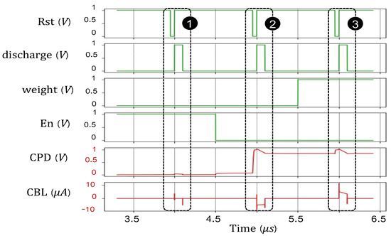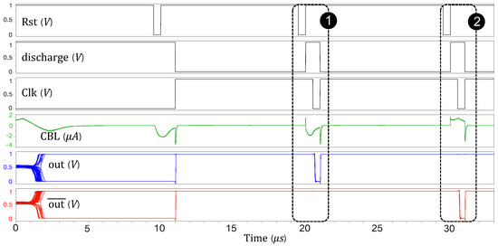 In this paper, simulations are conducted using the HSpice simulator for a 45 nm PTM low power metal gate at room temperature (25 °C). Figure 3 shows the functionality of one TCP. In this figure, as shown in ❶, when equals , is never charged, and the produced current on is approximately zero. On the other hand, in ❷, by changing the value to zero, with the first clock (0), CPD is charged to , and when is returned to 1 again, and is , start discharging. At the end of ❷, the value of the has remained the same. Everything in ❸ is similar to ❷ except the weight values. Before starting the sensing and processing phases, the pre-trained weights should be written into NVMs and remain unchanged in the TCPs. Nevertheless, to evaluate the output current, we changed the TCP weights. This simulation indicates TCP with negative and positive weights produces a current value of approximately −5 μA and +5 μA, respectively.
