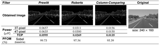 We demonstrate the advantages of the Ocelli design through an application-level evaluation. Regarding edge detection techniques, although the Soble mask is the most widely used algorithm, implementing two matrices, the X-direction and the Y-direction, consisting of five different weights is challenging. Thus, in our study, three energy-efficient filters are considered: the Prewitt (two matrices), the Roberts (two matrices), and the Column-Comparing (CC) technique (one matrix) including weights [25]. Figure 6 illustrates the power consumption results for three sensors after the masks have been applied. As a first observation, the simpler a mask is, the less accurate the results, and correspondingly, the less power is consumed. The CC mask is the smallest and simplest one that shows power efficiency at the cost of lower accuracy.