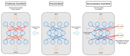 Depiction of neuromodulatory tuning (NT) in contrast with traditional fine-tuning (TFT). In NT, the weights of the pre-trained network are frozen, preserving all learned feature information pertaining to the original training task. A set of auxiliary bias neurons with randomly initialized weights is then inserted into the network, and the auxiliary bias weights are then updated in response to the new learning task. In this diagram, color indicates the weights’ update status: red for active, blue for frozen. NT requires far fewer parameter updates than traditional fine-tuning methods, although loss information must still be propagated backward through the entire network.