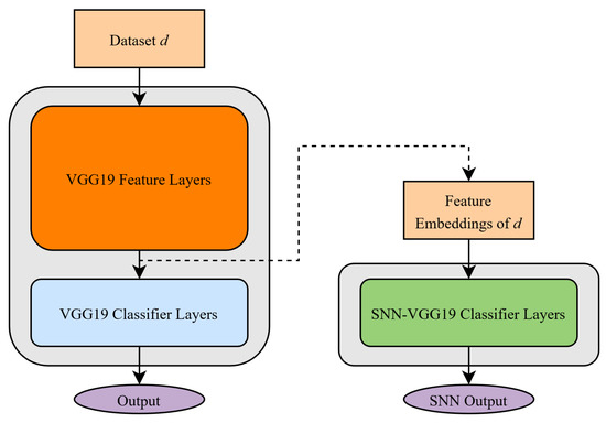 Representation of the Spiking Neural Network (SNN) experimental setup. In these experiments we construct a SNN that mimics the function and purpose of the traditional pretrained VGG-19 classifier layers. To accomplish this, we pass data from a dataset d, where d = {STL-10, Food-11, BCCD}, through the feature layers of VGG-19 to generate a feature embedding for a particular data instance. A traditional usage of VGG-19, like in Section 4, would then pass the feature embedding through the fully-connected classifier layers to produce a model prediction. In these experiments, however, we pass the feature embedding through spiking classifier layers which then in turn produce a spiking model prediction.