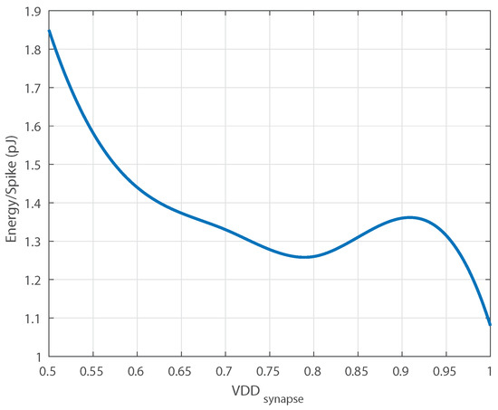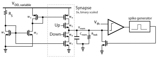 Each synapse operates at a supply voltage between 0.5 and 1 V. A higher supply increases the current in the synapse. The neuron core operates at a constant supply of 1 V. Adjusting the supply voltage of individual synapses or groups of synapses effectively changes the weights of the synapse connections. This change in behavior is analogous to the bias neurons in the software implementation and to what is observed biologically [53,54]. To make the synapse current dependent on the supply voltage , we use a current mirror with a resistive load. The current through an N-type MOSFET is given by