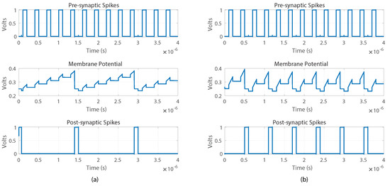 Neuron outputs with the same input spike pattern and synaptic weights, but with varied bias weights implemented as (a) mV and (b) mV.
