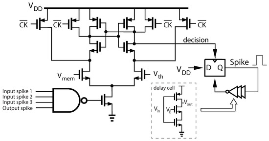 A schematic of the neuron core is shown in Figure 5. The threshold comparator is implemented with the StrongARM topology. We choose a clocked topology to reduce static power, especially when compared to inverter based threshold detectors. Instead of a fixed-period clock, we only clock the comparator after an input spike or after an output spike. We use a 4-input NOR gate to generate the comparator clock. This ensures that power consumption is minimized in a network trained for minimal spiking activity. The membrane capacitance is always reset to mV and the comparator has a fixed threshold of mV. We choose to give at least 100 mV of swing without driving the synapse current sources into the triode region, even when the synapse power supply is 0.5 V. Once the membrane potential crosses the preset threshold, the spike generation circuit is triggered. The spike is generated using a self-reset DQ fip-flop with current-starved inverter-based delay cells between Q and reset. The delay cells utilize parasitic capacitance to increase delay so as to decrease the number of stages needed for a certain spike width.