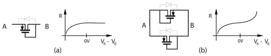 The membrane capacitor is a custom 50-fF finger capacitor which occupies only 27 m. Because the membrane capacitance is only 50 fF, the neuron needs an extremely large resistor for a sufficiently low leakage current. Instead of using a polysilicon resistor which would occupy large area, we implement a CMOS pseudo resistor using a PMOS transistor which occupies only 0.7 m × 0.5 m and achieves approximately 400 M (Figure 6). The pseudo-resistor is implemented as two PMOS transistors connected in a transdiode configuration. The simplest of pseudo-resistors have an asymmetric resistance-voltage characteristic, making them unusable for this neuron because the membrane potential can go both above and below , and must have the same up and down leakage current. To solve this, we use two psuedo-resistors in parallel with opposite connections polarities. This halves the effective resistance, but creates a symmetric resistance-voltage characteristic.
