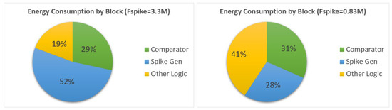 The proposed neuron achieves performance competitive with the state-of-the-art in standalone neuron circuits (see Table 9). The total power for the neuron core varies with spike rate. Figure 7 shows the distribution of power for two spike rates and Figure 8 shows the energy/spike vs. spike rate.