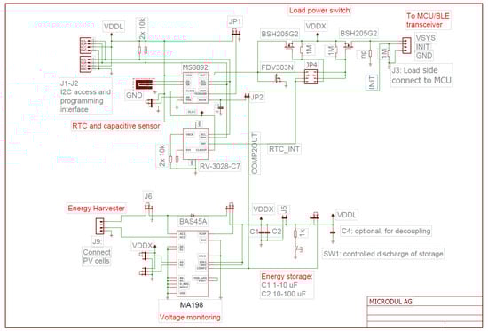 - The MA198 power manager [59].This is a device from Microdul AG and Algra AG in Switzerland. It was designed for energy harvesting and other low-power applications. It allows a storage element to be charged by an external harvester source, with minimal interference with the final load. In this work, only a single comparator of the MA198 is used. The comparator monitors the voltage of the storage capacitor and separates the solar cells and storage from the load during the initial energy harvesting process. Once a predefined voltage is reached, energy is allowed to flow into the load. A built-in hysteresis avoids unwanted restart operations. The device typically requires 30 nA at room temperature. In this work, the threshold for detection was set to 2.4 V using external pins (2.25 V measured). The use of the comparator enables the system to harvest and accumulate, even when the power delivered by the solar cell is very small (low light intensities).