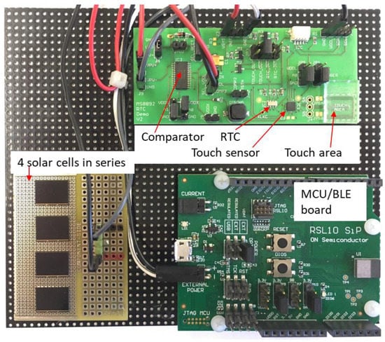 - The energy harvesting board with the comparator, RTC, and touch sensor.