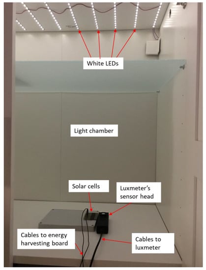 - The light cabinet.For the tests, the solar cells and the luxmeter’s sensor were kept in a chamber illuminated using white LEDs, as shown in Figure 10. The intensity of the LEDs was controlled using an appropriate external power supply. A luxmeter was used to set the desired light intensity and to log its value during the tests. There is a glass between the LEDs and the device under testing and luxmeters, which helps in setting small intensities but also has an impact on the light characteristics. The walls are reflective, which is fitting for many indoor operating environments.