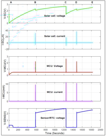- D> to <E: Measurements shortly after D (M1) and shortly before E (M2) (Table 5).The average power delivered by the solar cell is 841 nW in this time slot, with a peak of 1.21 µW. The power consumption is due to leakages and supply currents of the comparator, RTC, and touch sensor because those elements are active. The voltage of the storage capacitor goes up.
