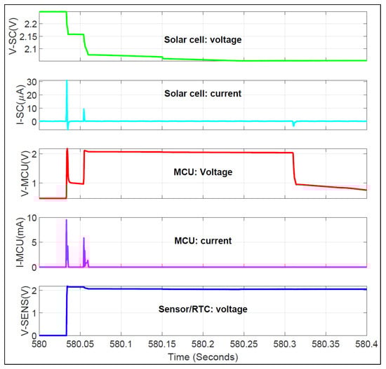 - Event A: The energy storage is discharged.The storage is manually emptied before the evaluation of the harvesting process begins. As the solar cell delivers energy, the storage voltage goes up. The comparator powers up with it and starts monitoring the storage’s voltage. As long as the voltage is below 2.25 V, the load on the solar cell only consists of the storage capacitor, the monitoring comparator, and small leakages. The RTC, sensor, and MCU are all switched off. The voltage of the storage element continues to climb.