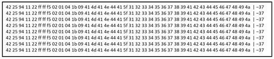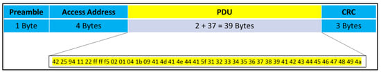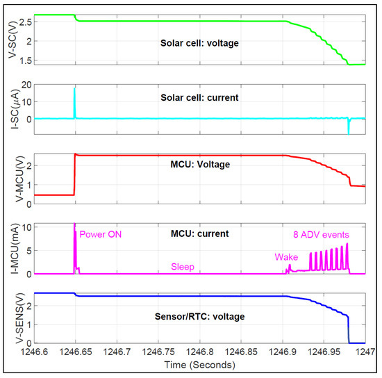 - Signals at event C:Figure 14 shows a magnification of the signals at position C. The MCU is powered on (time 1246.65 s). Initially, much current is drawn, which corresponds to the cold start of the MCU. After the sleep delay implemented in the firmware, the MCU wakes up (time 1246.9 s), goes into processing mode, and transmits ADV frames. Frames are sent until the MCU is turned off. The activities of the MCU last 335 ms and require a total of 262 µJ. They are divided into 34 µJ from power on until wake up from sleep, 48 µJ until the start of first frame, and 180 µJ for transmitting all the ADV events.Data transmitted during the ADV events are received by the sniffer (Figure 15). The same information is sent on the three ADV channels for each event. Because the sniffer only scans one ADV channel, 8 frames in total are received. The events correspond to the current peaks seen on the I-MCU current trace (Figure 14). The RSSI (received signal strength indicator) calculated by the sniffer has a value of −37 dBm for all frames (the sniffer acting as receiver is not far away from the transmitting device, as can be seen on the setup (Figure 9)).Figure 16 shows the structure of an ADV frame that is sent. The PDU (protocol data unit) has 39 bytes, corresponding to an on-air frame size of 47 bytes at 1 Mbps. In the best case, all 3 ADV frames of each event are transmitted, which means 8 × 3 = 24 frames. In the worst case, the last 2 frames of the last event (channel 38 and channel 39) are not transmitted. That means 22 frames are transmitted. Therefore, the energy harvested is enough to transmit at least 22 frames with a total of 47 bytes each.