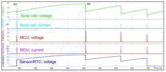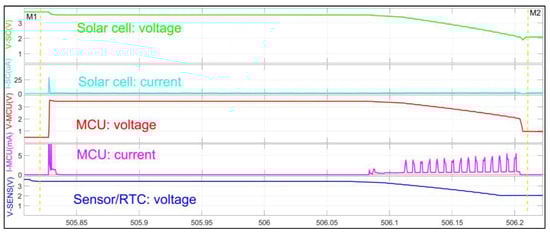 - B> to <C: Measurements shortly after B (M1) and shortly before C (M2) (Table 3).The average power delivered by the solar cell in this time slot is 856 nW, with peaks of 1.26 µW. In this phase, the energy is consumed by leakage in the storage, leakage in the power stage, the comparator, the RTC, and touch, as the RTC and touch are also active in this time window.