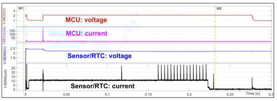 - Signals at event D:At event D, the comparator threshold is reached, and the touch sensor and RTC are powered. The system behaves as in case of event B. The energy storage was not fully discharged at event C. Therefore, event D is reached faster (here, 231 s). It means that the system reacts faster once it has been started. The application firmware can be written so as to switch off the MCU earlier and avoid that the RTC and touch sensor be switched off. That would allow the system to react even faster. In the case that the RTC is used for timekeeping, time information would not be lost. The RTC itself can accept a backup storage element that allows it to keep information for a certain time, even when power is not available. That feature was not used in this work.