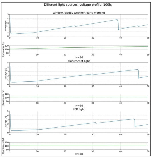 - In general, the voltage delivered by the solar cell decreases as the illuminance is reduced. In order to reach the required voltage level, a booster can be used, which often requires additional energy to start up. For example, the EM8500 power management device typically requires 3 μW for a cold start and 1 μW while running [54]. The AEM10941 power management device requires a minimum of 3 μW to cold-start [55]. In this work, the alternative chosen to avoid the relatively high energy requirement of boosters at start-up is to connect several solar cells in series, which leads to additional components.
