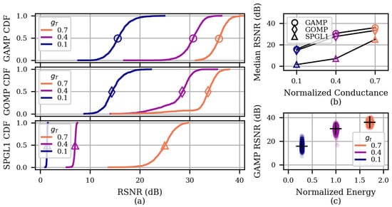 All algorithms were tested in a Python environment, using the spgl1 (https://spgl1.readthedocs.io/en/latest/ (accessed on 30 November 2022)), and magni [] libraries, the latter including an implementation of the GAMP decoder. The GOMP algorithm was constructed from an existing implementation of OMP (https://github.com/davebiagioni/pyomp (accessed on 30 November 2022)). The SPGL1 decoder requires a parameter representing the expected measurement error. For each target conductance being tested, was computed by encoding a batch of inputs with the perturbed and ideal sensing matrices, computing the norm of the difference and then averaging across the batch. The GAMP decoder instead requires an estimate of the input channel properties, namely the mean and variance of the nonzero components in the sparse representation of the inputs. Moreover, an estimate of the variance of the measurement noise is needed for the output channel model.