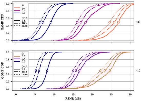 The simulation results are observed in Figure 5, where only the results for the GAMP and GOMP decoders are shown, which are the most relevant. Notice how the curves associated with different drift setups have very limited degradation, notwithstanding the extreme conditions being tested. Indeed, the loss in median performance observed with the GAMP decoder, from 2 h to the end of the bake, is limited to 2.3 dB for both the and setups.