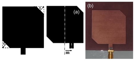 The corners are truncated from a height, t (Figure 3a). The feeding line is decentered of a distance, m. The gain and the axial ratio of the patch antenna are optimized through simulation to evaluate the dimension t. The reflection coefficient is affected by the feeding line position. A trade-off is defined, yielding the corner dimension, t (4.7 mm) and decentering parameter, m (+2 mm). The dimensions of the antenna in Figure 3 are listed in Table 4. The simulated axial ratio is 0.7 dB at 2.45 GHz. In addition, the simulated and measured realized gain of the antenna is 2.03 dB and 1.70 dB, respectively.