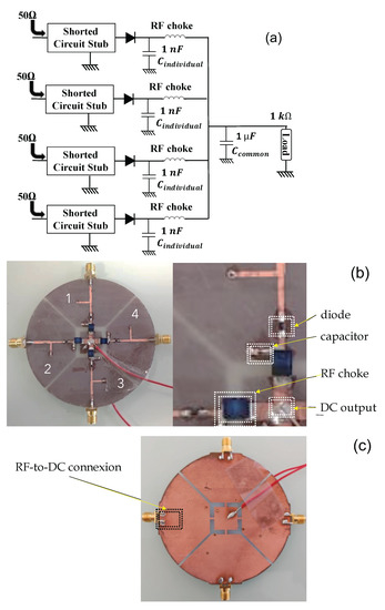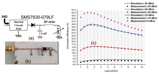 The same Schottky diode (SMS7630) will be selected later on in Section 4, and the rectenna load is chosen to be 5.1 k, close to the junction resistance of the diode [60]. A measurement detailed in Section 4 shows that a different choice of resistor value should be considered.