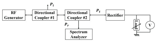 The measurements in Figure 6c are based on a method to insure a specific input RF power level at the rectifier input, independently of the matching network adequacy with respect to the operating conditions. The setup in Figure 7 is used for the measurements and comprises directional couplers, connectors and cables, where power losses, P, must be identified prior to the application to the rectifier. The reflected power, P at the rectifier input is measured to deduce the power absorbed by the rectifier input, P. The RF generator power level, P, is adjusted to set P to a given and known level (namely, 0, −10, −20 and −30 dBm, respectively, in Figure 6c). The rectifier output voltage is measured in open-circuit conditions, which implies a certain RF generator power level to obtain the targeted rectifier input RF power. The tuning is repeated for each value of the load at the output of the rectifier. The determination of the rectifier near optimal load benefits from this measurement approach, when the output voltage reaches half the open-circuit voltage value for a same input RF power level.
