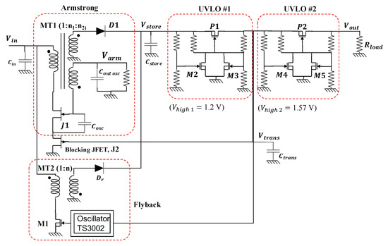 A voltage conversion circuit was proposed in [70] to deal with the large internal impedance of the rectenna and cold-starting at the minimum voltage of 180 mV (Figure 11). The circuit was improved in [71] to deal with a 100 W micro-voltage source. The main converter in Figure 11 is a Flyback DC-DC converter operating in discontinuous conduction mode (DCM). It was demonstrated in [71] that the input impedance, R, of the Flyback is defined in a straight-forward manner as follows: