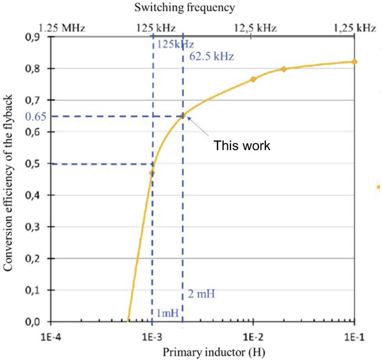 where L is the magnetizing inductance of the coupled-inductance device, f is the switching frequency and d is the duty cycle (50% in most cases). Given component references and considering an ideal coupled-inductance magnetic device, it is possible to build the abacus in Figure 12 to show the trade-off between the efficiency and the size of the magnetic device. When crossing this abacus with the commercial magnetic device offer, the designer sets the efficiency of the Flyback converter as well as its size. The size may be bulky if a large magnetizing inductance is selected with a low series resistance, i.e., a large number of winding turns with a large section conductor. Besides, popular integrated circuits in Table 7 offer a better trade-off in terms of size, but the cold start-up voltage must be higher than the one of the lab-scale converter or the integrated maximum power-point tracking algorithm will definitely not be adapted to a RFEH. The emerging commercial circuit [65] is one of the most appropriate offers as of today to the best knowledge of the authors, if a high integration factor is sought.