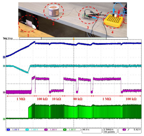 Evaluation of the rectenna vehicle operation at 2.45 GHz. (top) test setup (1-emitting patch; 2-circular antenna; 3-voltage converter; 4-load). (bottom) main waveforms of voltages in the circuit in Figure 11a (blue: V; light blue: V; purple: V; green: V).