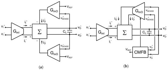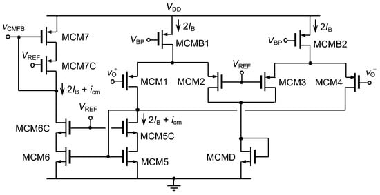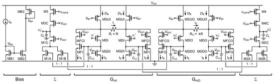 The block diagram of the proposed FD IA is depicted in Figure 2b. As observed, the feedback network is implemented differentially and, hence, only one output transconductor is required. Nevertheless, it is well known that the establishment of a differential feedback loop relies on the assistance of a CM control network, in order to dynamically set the CM component of the output voltage to the intended level. With this purpose, the CMFB section illustrated in Figure 2b has been included. As observed, the DC component of the output voltage is induced to be equal to  by the CMFB circuit, rather than being applied to the output transconductor, as it is done in the PD structure in Figure 2a. The existence of well-differenced signal paths for the DM and CM components in the FD approach allows the individual optimization of their response, which is not possible in the PD solution, where the control of the output CM voltage is embedded in the implementation of the output section of the circuit.