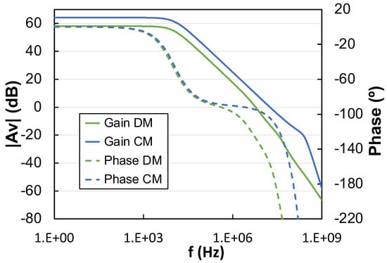 The load capacitors, , were built on-chip as metal-insulator-metal devices to make stable the feedback loop established around the transconductor . The design criterion selected was to ensure a phase margin of 60° considering the nominal value of the load capacitors, equal to 1.33 pF each, and the parasitic capacitance also connected to the output terminals due to the test buffer. In addition, it is worth to point out that the effective value of the parasitic capacitance introduced by the test buffer slightly relies on the value of the total external capacitance, associated to the PCB and the test probe used for measurements. This external capacitance has been estimated to be around 30 pF in most of the test configurations followed. Under these conditions, the open-loop frequency response of the DM and CM signal paths has been simulated and is represented in Figure 6. For the DM signal  = 58.0 dB and  = 5.9 MHz with a phase margin of 52.8° and a gain margin of 17.6 dB, whereas the CM signal response provides  = 64.2 dB and  = 18.1 MHz with a phase margin of 75.5° and a gain margin of 14.3 dB. These results show the stability of both the DM and the CM feedback loop and confirm the requirements imposed in (7a) and (7b) to the CM signal path. The bandwidth of the CM signal is noticeably higher than that of the DM component. This is due to the fact that the linearization carried out in the input differential structure of the IA leads to a lower effective transconductance as compared to the CMFB section, which results in a narrower frequency range.