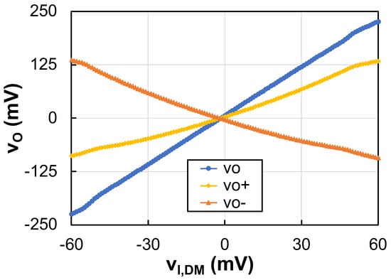 The DC measurements on the 10 available samples allowed to obtain an average DC supply current for the IA equal to 266.4 A, with a standard deviation of 2.6 A. The DC voltage level shift introduced by the on-chip buffer did not allow characterizing the actual output voltage of the IA, expected to be very close to . Hence, only the standard deviation of the buffered output voltage, equal to 3.63 mV, is reported in order to determine the variability of the output voltage among the different samples. The experimental  DC transfer characteristic of the IA is represented in Figure 7. The CM level of the output voltage, defined as , has been used to shift all plots from their original DC level down to zero, so that results can be more easily interpreted. A linear voltage range at DC larger than ±50 mV can be inferred for the differential output response. As observed in Figure 7, the non-linearity appreciable in  and  is cancelled out when the overall output signal is obtained as the difference of the individual responses, i.e., .