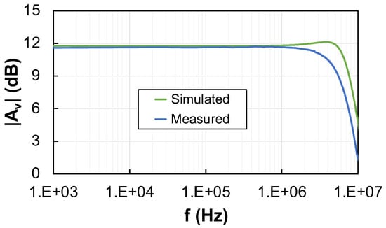 The simulated and experimental frequency response of the IA is illustrated in Figure 8, where the magnitude of the DM voltage gain is depicted. From the experimental response the voltage gain in the passband, , and the BW of the IA can be extracted, obtaining values equal to 3.78 V/V (11.4 dB) and 5.83 MHz, respectively. The gain value is in close agreement with the design value of 4 V/V or 12.4 dB (relative error of 5.0%) and with the simulated value of 3.69 V/V or 11.34 dB (relative error of 2.4%), whereas the measured BW deviates from the corresponding simulated value, equal to 7.76 MHz (relative error of 24.8%). The difference between the simulated and the experimental responses in Figure 8 has two possible reasons. On the one hand, it has been found that the on-chip voltage buffer is more sensible to external load capacitors than expected from simulations. On the other hand, the BW of the IA is determined by the on-chip load capacitors illustrated in Figure 3, the value of which can suffer important absolute variations during the fabrication process. The nominal simulated value of the BW has been complemented with the result extracted from a 1000-run Montecarlo analysis, considering mismatch and process variations, which has been found to be equal to 10.27 ± 4.70 MHz. Considering the standard deviation as a suitable error margin, the lower bound of the statistically simulated BW encloses the values of both the nominally simulated and the measured BW. The time response of the proposed IA, depicted in Figure 9, has been used to confirm its stability. In particular, a 100-mV input signal (yellow plot) is applied and an appropriate establishment of the output voltage (green plot) can be observed.