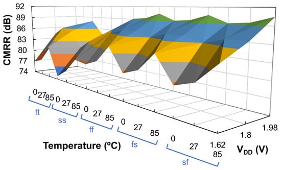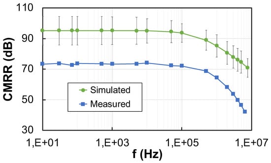 The response to CM signals has also been obtained. The CMRR has been simulated and measured as a function of the frequency of the input signal and is shown in Figure 10. In the simulated plot (in green color), the average value, extracted from a 1000-run Montecarlo analysis including mismatch and process variations, is represented, whereas the error bars indicate the standard deviation, . As observed, the experimental CMRR lays below the error margin when the standard deviation is considered, but it has been proved that is enclosed by a 3- error region. The measured CMRR at low frequencies and at the frequency of the BW is equal to 73.3 dB and 42.0 dB, respectively. Furthermore, the impact of process, voltage, and temperature (PVT) variations on the CMRR at DC has been determined by nesting a 100-run Montecarlo analysis and a corner analysis. In particular, typical-typical (tt), slow-slow (ss), fast-fast (ff), fast-n-slow-p (fs), and slow-n-fast-p (sf) corners were considered for the active devices, whereas the temperature was set to values (0,27,80) °C and the supply voltage was adjusted to (1.62,1.8,1.98) V, i.e., a variation equal to ±10% was assumed. The corresponding results are summarized in Figure 11, where in the axis corresponding to the temperature the considered range has been replicated for each corner of the active devices. As observed, the CMRR varies between 74.8 dB and 90.5 dB.