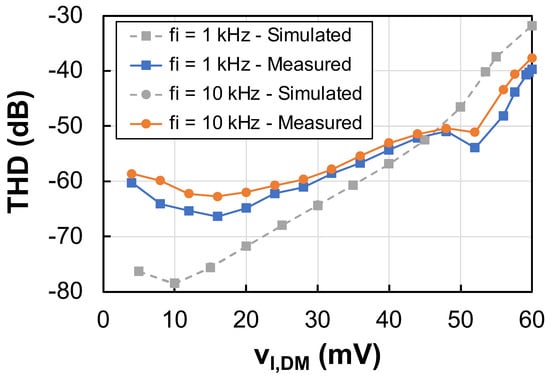 The noise response of the FD IA has also been characterized. In particular, the spectral density of noise has been simulated and measured and is depicted in Figure 12. In addition, the noise has been integrated over a frequency band between 100 Hz and the frequency of the BW, obtaining a value equal to 86.4 V. The calculated experimental noise is slightly higher than the actual value, due to the finite approximation followed to integrate the noise. In any case, the simulated noise, equal to 74.7 V (relative error of 15.7%), is much lower. The reason of the noise increase in measurements is ascribed to the experimental setup and to the contributions of the different auxiliary circuits used for the test, as illustrated in Figure 5b and already indicated at the beginning of this section. The THD has been used to asses the linearity of the dynamic response of the FD IA. In Figure 13 the simulated and experimental THD of the output voltage is represented as a function of the input DM signal amplitude for frequencies of 1 kHz and 10 kHz. The simulated THD is reduced as compared to the experimental response for small values of the input signal due to the lower noise floor level in simulations. Nevertheless, for high input signals the measured response results even more linear. Using the widespread criterion of considering the 1%-THD as a limit to determine the maximum input signal that can be processed with reasonable linearity, experimental values of 59.6 mV and 57.6 mV were obtained for input frequencies of 1 kHz and 10 kHz, respectively.