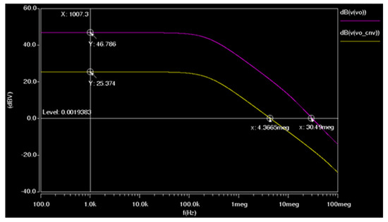 AC simulation results of the op-amps in voltage follower configuration (by connecting directly the output labeled Vo in Figure 1b to the negative op-amp input), are depicted in the same technologies, in Figure 6, Figure 7, Figure 8 and Figure 9. In all cases, the AC response of the voltage at the terminal labeled Vout in the circuits of Figure 1b and Vo in Figure 1a (at the ungrounded terminal of CL) is displayed. As can be noticed, the voltage follower bandwidth is improved by 5 to 10 times w.r.t those without resistive local common mode feedback.