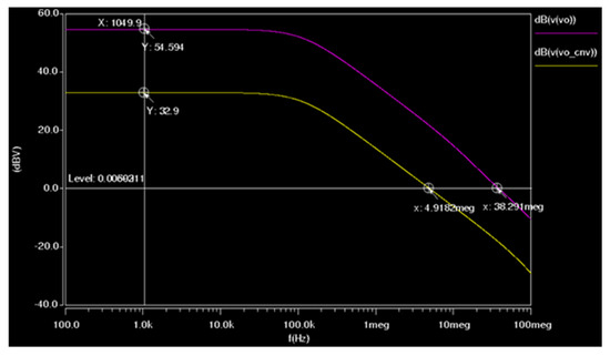 A comparison among several simulations was made using 22 nm, 45 nm, 90 nm, and 180 nm CMOS technologies. The simulations in 22 nm, 45 nm, and 90 nm were performed with generic models available from North Carolina State University [11]. The simulations in 180 nm were performed using parameters of a TSMC commercial technology available through MOSIS [12]. In all cases, the bias current per branch is IB = 2.5 μA; therefore, the total quiescent current per circuit is ItotQ = 10 μA. For all circuits, PMOS and NMOS transistors had dimensions W = 10 µm and L = 2Lmin, where Lmin is the minimum feature size of the technology, also in all cases, the load capacitance was CL = 2pF. The simulated open-loop AC responses are depicted in Figure 2 for 22 nm. In this case, a value R = 500 kΩ was used. The trace v(vo_cnv) refers to the conventional topology of Figure 1a and v(vo) to the enhanced topology with resistive local common mode feedback of Figure 1b. Transistors operate in subthreshold and since they have the same bias currents their transconductance gains are similar. Values of resistors R were selected to obtain similar enhancement factors Kenh in all cases. The values of resistors R are not equal in all technologies since the output conductance of the transistors (which also affects Kenh as discussed in Section 2) are different in each technology. Simulations of the open-loop gain were performed by connecting a large valued feedback element RF (100 MΩ) from the output of the op-amp Vo (at the junction of the drains of M3P, M4P, and Rs) to the negative input as shown in Figure 1b. A grounded large valued grounded capacitance (CF = 1F) was connected to the OTA negative input terminal. The open-loop response displayed corresponds to the magnitude and phase of the voltage at the node labeled Vo in Figure 1.