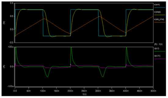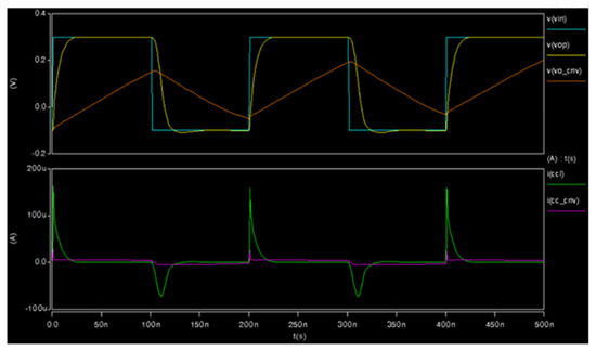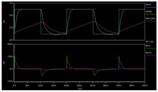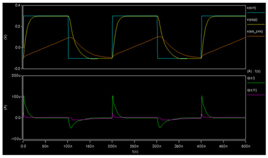The slew rate (SR) and the peak output current capability were determined by performing transient simulations applying a 5 MHz, 0.4VPP pulse input signal to the op-amps configured as voltage followers. Input and output voltage waveforms (top) as well as the load capacitor currents (bottom) for 22 nm, 45 nm, 90 nm, and 180 nm technologies are depicted in Figure 10, Figure 11, Figure 12 and Figure 13.