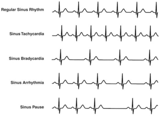 Cardiac arrhythmia is a common heart disease that could be defined as a disorder or an abnormality in the normal activation sequence of the myocardium, giving rise to an irregular heartbeat or abnormal rhythm []. Arrhythmia can take place in a healthy heart with minimal consequences; however, it may also indicate a serious problem, which can lead to stroke, sudden cardiac death, scarring of heart tissue, changes in heart structure, or premature beats due to blood flow failure in the body []. Analysis of RR intervals can be used to determine the heart rhythm because an abnormal heart rhythm causes characteristic variations in RR-interval lengths.