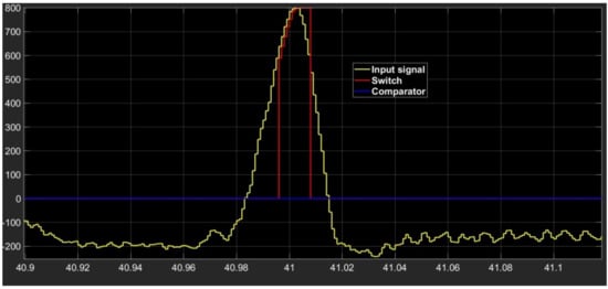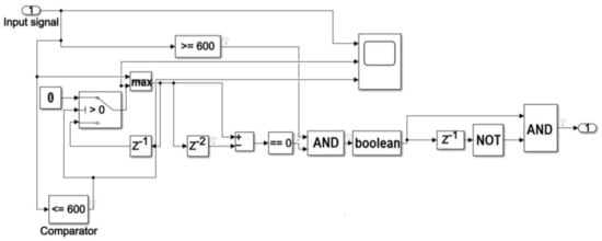The preprocessed ECG signal is fed into a switch block whose output is 0 if the signal width is below the evaluated threshold value, otherwise it is equal to the input (Figure 3).
