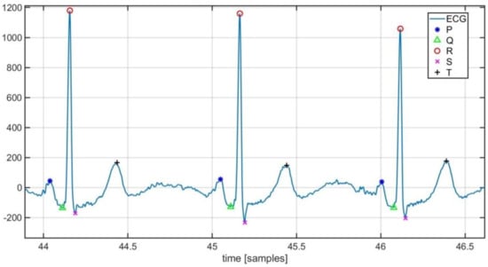 QRS complexes and related R peaks are the most used parameters for a basic evaluation of the health status of the heart. In fact, heart rate and other parameters can be evaluated to prevent the onset of some diseases, such as ischemia, after the QRS identification []. The analysis of RR-interval lengths (that is the time between two consecutive R peaks) makes the heart-rate variability (HRV) study possible. HRV measurement provides significant information regarding cardiac irregularities or injuries. The activity of the autonomous nervous system is also depicted by the HRV analysis, and it is used as a quantitative indicator of stress [,].