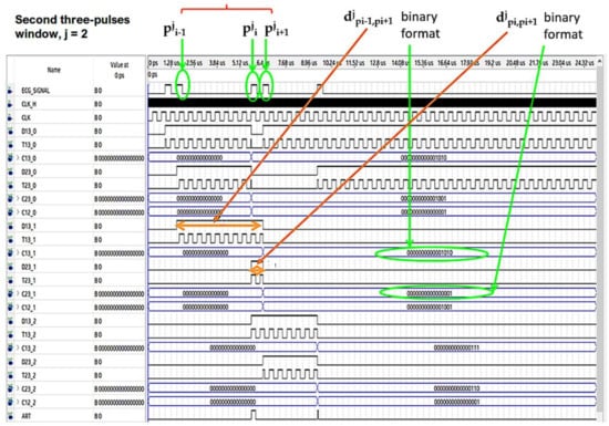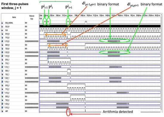 In Figure 7 and Figure 8 the operating procedure of the classification phase is better detailed. These figures show the results in ModelSim, which is an environment for the simulation of hardware description languages in Quartus. As soon as the first QRS complex is locked, a time window with a duration equal to three pulses (triplet) is defined, onto which a reference clock signal is superimposed (Figure 7). After the first triplet has been analyzed, the system automatically moves to the second one (Figure 8) and so on in a way that any arrhythmias are detected.