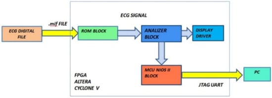 A great deal of FPGA-based wearable devices for the capture and analysis of bio-signals are available on the market according to recent trends in health-monitoring devices [,]. The study of bio-signals allows us to control and assess the functionality of the organ that generated it. For instance, the shape of the electrocardiogram signal (ECG) is considered by cardiologists to be representative of cardiac physiology. Diagnosis of heart conditions by means of ECG is the basic procedure to prevent and control cardiovascular pathologies, which are the main cause of death worldwide [,].