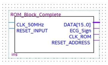 The two inputs of the ROM module, named CLK_50 MHz and Reset_Input, are the operating clock provided by the selected development board and the input for the ROM address reset, respectively. The four outputs are: