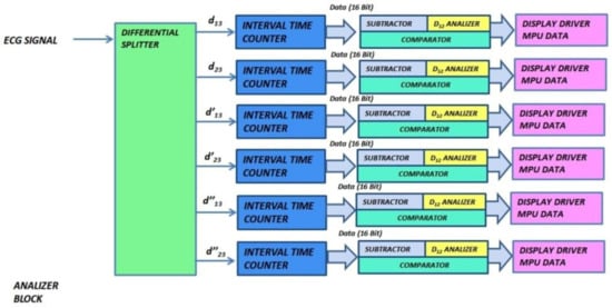 The block diagram of our diagnostic device is indicated in Figure 9. It is composed of three functional modules: the ROM block, the analyzer block, and the MCU block. The input of the system is the vector of ECG data and the outputs are the number of QRS waves detected, the number of bradycardic heartbeats, the number of tachycardic heartbeats, and the number of arrhythmias detected. Diagnoses relating to the PE and QT were analyzed by the MCU block and can be notified by a message on the display or by flashing LEDs.