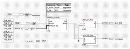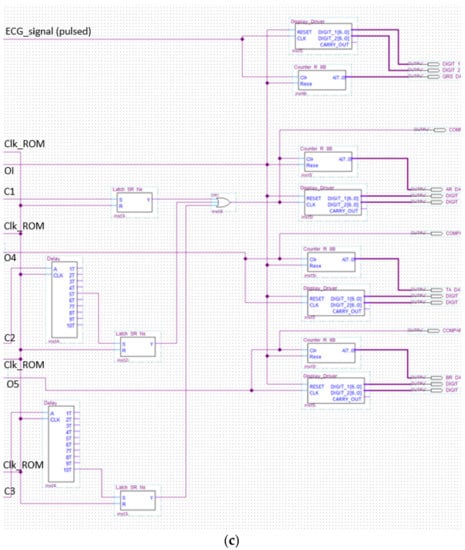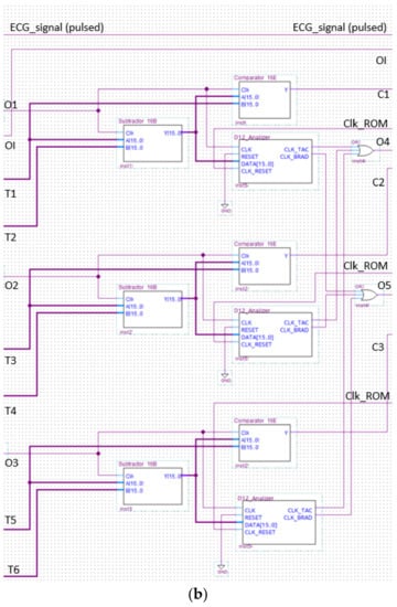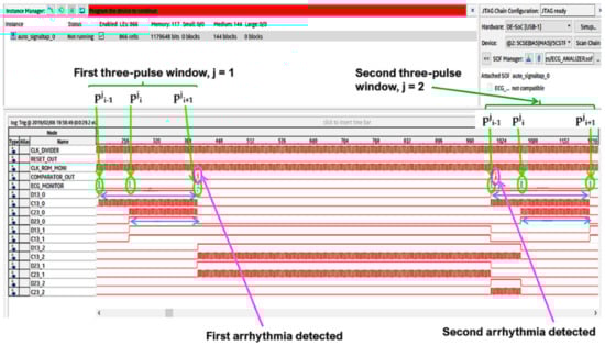 The Signal Tap II Logic Analyzer (embedded in Quartus prime IDE) and the Zeroplus lab-c (an external USB logic analyzer) were also used for the system debug. Results of these analyses reflect specifications and simulations of the sequential machine performed by using the waveform editor tool of the Quartus IDE. In Figure 22 and Figure 23, the results of the instrumental analysis are shown. After the accurate detection of R peaks, the time distance between two consecutive R peaks of the pulses-transformed ECG signal was evaluated and compared according to the conceived procedure. The detection of an arrhythmic event is indicated by the comparator by the generation of a clock signal, which enables a counter.
